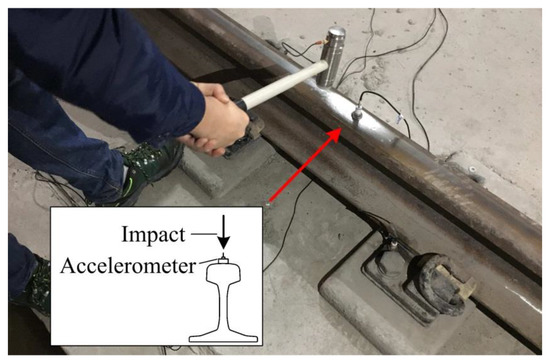 The rail accelerance was measured for the purpose of verifying the accuracy of the Timoshenko-beam track model and the SEM. An accelerometer was placed on the mid-span railhead, and then a hammer was used to impact the same position. The direct vertical accelerance of the mid-span rail was obtained by processing the signals of the accelerometer and the hammer. The field measurement is shown in Figure 8.