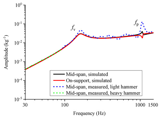 According to Figure 10, the simulated amplitude of the direct mid-span rail accelerance increases with the increase of the frequency in the low-frequency range and reaches the peak at 163 Hz where the vertical rail resonance occurs. The resonance frequency is denoted by fv, and it depends on the vertical fastener stiffness. In the frequency range of 200–1000 Hz, the accelerance amplitude does not change much. Another peak appears at 1063 Hz where the first-order vertical pinned–pinned rail resonance occurs. This resonance frequency is denoted by fp. The corresponding modal shape turns out to be a standing wave with nodes at the fastener, and the half-wavelength equals to the fastener spacing. The on-support and mid-span rail accelerance amplitude curves coincide with each other besides the parts near fp. As the nodes of the standing wave are located at the fasteners, there is a trough at fp in the on-support rail accelerance amplitude curve.