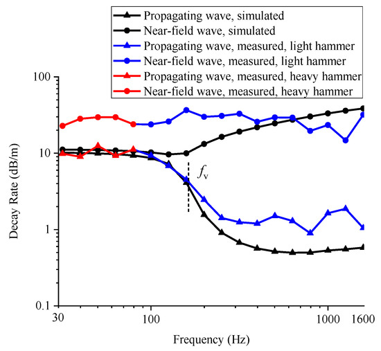 The measurement and the simulation of the DR of the propagating wave match well. Below the center frequency of 160 Hz, they coincide with each other. In the high-frequency range, the measured DR keeps the low values as the simulated DR does. Therefore, the periodic track model and the STMM are adequate for studying the attenuation characteristics of rail vibrations in the longwise direction.