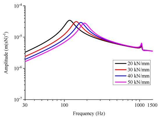 The simulated influence of the vertical fastener stiffness on the direct mid-span rail mobility amplitude is shown in Figure 14. The general vertical stiffness of the non-vibration-mitigation fasteners in subway lines is 30–40 kN/mm. The vertical stiffness of the vibration-mitigation fasteners can be 20 kN/mm.