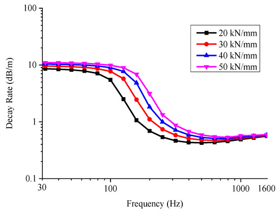 In order to directly elaborate the influence of vertical fastener stiffness at different frequencies, the relative sound power level of the rail subjected to a harmonic point excitation is investigated in this section, while the rail sound power level with the vertical fastener stiffness of 50 kN/mm is taken as the reference. The simulated influence of the vertical fastener stiffness on the relative sound power level of the rail subjected to a harmonic point excitation is shown in Figure 16 (in the form of the one-third octave spectra).