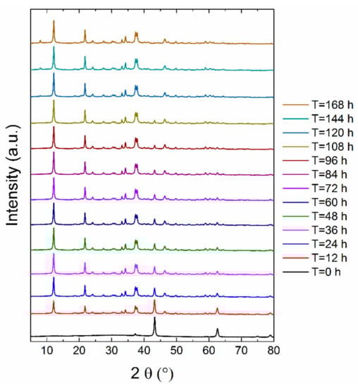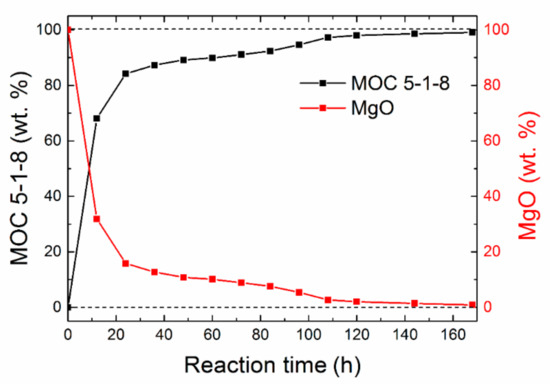At the beginning, the kinetics of formation of MOC 5-1-8 was determined using the XRD analysis on the test samples taken every 12 h for seven days (see Figure 1). The first measurement showed that only MgO (ICDD 01-075-0447) was present in the sample because of its insolubility in water, whereas magnesium chloride was completely dissolved. The reflections of MgO were found at 2θ = 42.9 (reflection 400) and at 2θ = 62.2 (reflection 440). The formation of Phase 5 (ICDD 00-007-0420) occurred rapidly; after 12 h, almost 69% of MgO already reacted. The strongest reflection (100) of MOC 5-1-8 was detected at 2θ = 12.0.