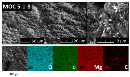The XRD measurements showed rapid formation of MOC 5-1-8 phase, which was almost completed after 96 h. This finding is promising for both in situ mixing of MOC 5-1-8-based materials and prefabrication of specific construction elements. The rapid formation of the MOC solid and dense structure and, thus, rapid achievement of mechanical strength compared to the much slower setting and hardening of Portland cement-based products is one of the favorable MOC properties which can be beneficially used in several practical applications, such as in flooring systems, rapid repairs, etc. Based on SEM and TEM data, the needle-like crystalline structure of Phase 5 was observed and it was obvious that this structure is highly compact and solid. This was confirmed by compressive strength measurement, which was ~55 MPa for the reference MOC 5-1-8 sample. This four-day compressive strength was similar to the 28-day compressive strength of Portland cement.