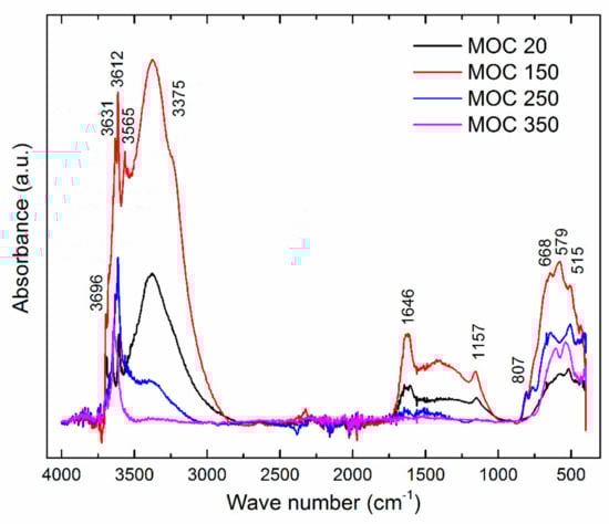 Furthermore, we tested the reference sample and samples after thermal exposure in order to analyze the thermal stability of MOC 5-1-8 phase. The collected FT-IR spectra are presented in Figure 6, and assignments of the major absorption bands of reference sample are summarized in Table 1. It can be seen that the tested magnesium oxychloride cement phase 5-1-8 contains the bands from the fundamental vibrations of structural H2O and the lattice vibrations of MgCl2 and Mg(OH)2. The absorption bands between 3700 and 3300 cm−1 were assigned to the stretching modes of O–H bonds in hydroxyl groups and in water. The water release is clearly visible on the bands in the range of 2000–3700 cm−1, which were contributed by the symmetric and asymmetric stretching mode of O–H bonds in H2O and Mg(OH)2 [31] after thermal exposure. The band intensities at 3375, 1646, 1608, and 1157 cm−1 were smaller and, finally, in the case of sample MOC 350, the band assignments to the stretching modes of H–O–H in H2O were missing. The series of modes in the range of 1000–400 cm−1 resulted from the lattice translation modes (Mg-OH) and vibrational modes of Mg–O/Mg2+ and O/O–Mg–O/O–Mg2+–O bonds [32]. Lattice vibration modes of Mg–O/Mg–Cl bonds can be observed around 500 cm−1.