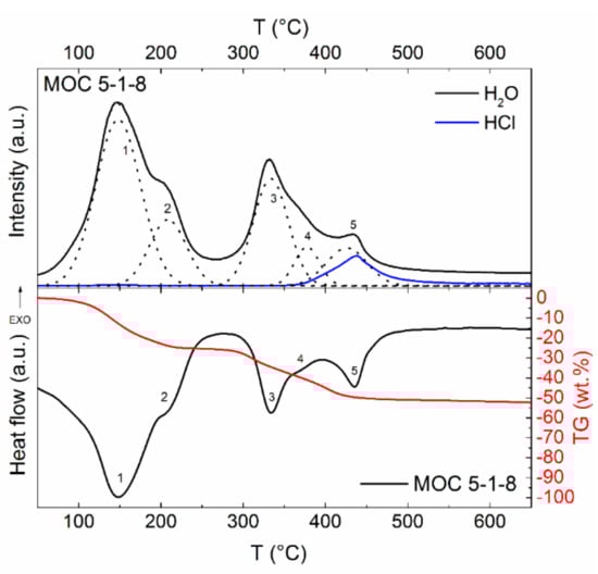 Simultaneous thermal analysis combined with mass spectroscopy (STA–MS) was used to analyze the thermal stability of the material under study (see Figure 7). The sample was gradually decomposed, and the final products were magnesium oxide, water, and hydrochloric acid, where H2O and HCl molecules were released in a gaseous form. According to the heat flow signal, five main endothermic effects accompanied by weight loss (seen on thermogravimetric curve) were detected.