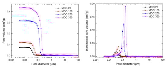 The pores size distribution is presented in Figure 9 and summarized in Table 3. The total open porosity measured by mercury intrusion porosimetry (MIP) (ψMIP) was 12.7%, 22.3%, 43.5%, and 54.1% for MOC 20, MOC 150, MOC 250, and MOC 350, respectively. Taking into account the mass of analyzed specimens which was about 1.0–1.5 g, the porosity data measured by MIP were in quantitative agreement with those assessed from the bulk density and specific density measurements. Both average pore diameter and threshold pore diameter significantly increased with the increased temperature of exposure, which clearly documented an opening of the pore structure of the investigated MOC samples due to the elevated temperature effect. The measured pore size distribution was classified according to the IUPAC (International Union of Pure and Applied Chemistry) classification of pore size [34]. IUPAC classifies pores as macro-pores (large capillaries > 0.05 μm), meso-pores (medium capillaries 0.05–0.002 μm), and micro-pores (small capillaries, fine pores < 0.002 μm). In our case, the pore size ranged from 0.0042 μm to 87.6 μm. The micro-pores were not identified, as the size of these pores was out of the measuring range of the Pascal 440 apparatus, which is able to detect a minimum pore size of 0.0036 μm. The temperature decomposition led to a notable increase in pore size. In MOC 20, most of the identified pores were in the meso-pore range. In MOC 150, meso-pores also prevailed, while, in MOC 250 and MOC 350, an increase in volume of macro-pores was observed, which was in a good agreement with the porosity data and loss of mechanical strength.
