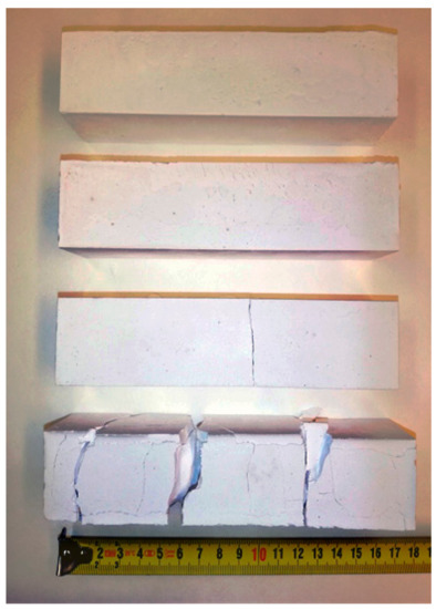 The failure of MOC samples after exposure to elevated temperatures; from top: MOC 20, MOC 150, MOC 250, and MOC 350.