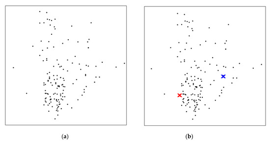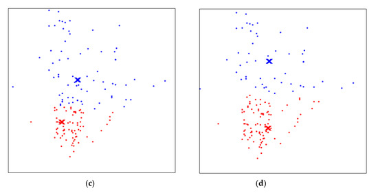The process of K-means is as shown in Figure 1. Figure 1a gives an original dataset for clustering. First, the clustering number k is determined and k initial centroids are randomly selected. We use k = 2 as an example here. In Figure 1b, red and blue forks represent two random clustering centroids. Then the nearest centroid is found for each point, and each point is assigned to the cluster corresponding to the centroid, after that the centroid of each cluster is updated to the average of all points in the cluster, as shown in Figure 1c. Finally, the final cluster centroids and the determined sub-clusters are formed after several iterations as in Figure 1d.