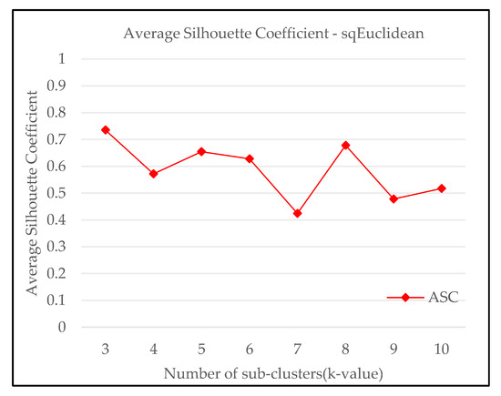 where . denotes the average of Euclidean distance between sample point . and other points in the same sub-cluster, which is used to describe Cohesion within cluster. . is the average of Euclidean distance from point to all points in the nearest sub-cluster, which quantifies separation between sub-clusters. Silhouette Coefficient is between −1 and 1. The larger the value is, the better the clustering effect will be. The average of Silhouette Coefficient of all points is Average Silhouette Coefficient. Hence, we choose the k-value that maximizes the Average Silhouette Coefficient. For example, we calculate Average Silhouette Coefficient of dataset in Figure 1a, as shown in Figure 2, when k = 3, Average Silhouette Coefficient reaches the maximum, so we choose k = 3 as the number of sub-clusters.
