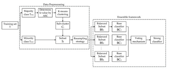 Eventually, after resampling the subsets and combining the sub-cluster and the minority class into k balanced subsets, base classifiers are trained on each balanced subset, and then integrated into a strong ensemble classifier by voting mechanism. Figure 3 gives the procedure of EKR. Data preprocessing contains K-means and resampling strategy, and ensemble framework refers to the process of training base classifiers on balanced subsets separately and combining them into a strong ensemble classifier.