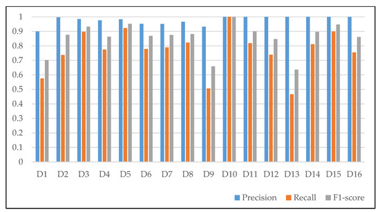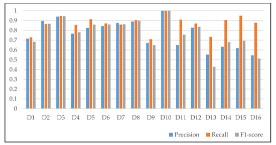 Precision, Recall, and F1-score for the overall samples of 16 datasets.