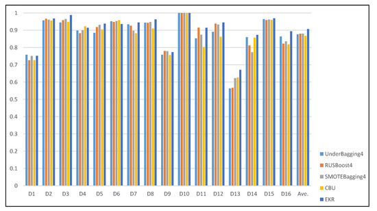 Four approaches have been used as the baseline for comparison with EKR, including UnderBagging4, RUSBoost4, SMOTEBagging4, and Clustering-based Undersampling (CBU), where the numbers 4 mean the numbers of base classifiers used in these ensemble approaches. Figure 7 shows AUC comparisons of four baseline models and EKR using C4.5 as base classifier in the form of histogram. As indicated by the results, the proposed EKR demonstrated the highest average AUC of 0.9068, followed by SMOTEBagging4, RUSBoost4, UnderBagging4, and CBU, average AUC of which are 0.8807, 0.8799, 0.8763, and 0.8672 respectively. Compared with the four baseline approaches, the average AUC of EKR increased by 0.0261, 0.0269, 0.0305, and 0.0396 separately. Except for datasets D4, D6, D9, and D11, EKR obtains the highest AUC. EKR is better than other algorithms. The resampling methods adopted by the four algorithms have their own limitations. The common point of CBU and EKR is to cluster the negative samples, but the k-value of CBU is determined by the number of positive samples, finally, only the nearest neighbor of cluster centroid is selected in each cluster to represent the whole cluster, which is combined with positive samples to form a balanced dataset. In this way, although the imbalance ratio of the data is reduced, only one classifier is trained. Though the effect of CBU is better than that of random sampling, the classifier lacks diversity. Therefore, inspired by CBU, EKR selects several representative samples from the sub-cluster and forms several balanced subsets with the positive samples, which increases the diversity of classifiers and improves the classification effect. SMOTEBagging4 uses SMOTE as the oversampling method to generate a large number of positive samples that are similar to the existing samples, which can cause overfitting problem. Random undersampling4 used in RUSBoost4 and UnderBagging4 may select unrepresentative samples or noise samples so that the information is beneficial to classification. EKR use Average Silhouette Coefficient to determine the optimal k-value before K-means for each dataset, this makes each sample closest to all samples in its sub-cluster and furthest from samples in other sub-clusters. EKR integrates the classification results on many balanced subsets, especially when the number of negative class samples in the subset is more than that of positive class samples, we use the resampling strategy introduced in Section 3.2, and select the most representative negative samples in each sub-cluster to replace the whole sub-cluster, and combine them with the positive samples to form the balanced subset. The resampling method proposed in this paper avoids the influence of blind random sampling on classification results.