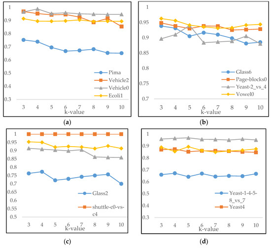 Figure 9 shows AUC comparison of different k-values on 16 datasets, k-value is from 3 to 10. The k-value of K-means clustering cannot be set too large, otherwise it may cause the sample not matching the most appropriate sub-cluster, so we use the Average Silhouette Coefficient to calculate the k-value, which ensures the large Cohesion within the sub-cluster and the large separation between sub-clusters. The results show that the most appropriate k-value is basically between 3 and 5 in all datasets, and the AUC value corresponding to the optimal k-value is the highest.