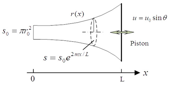 The physical model, shown in Figure 2, is a piston-driving exponential-shaped resonator which is closed rigidly at the small end (left end, x = 0). The vibration of the piston generates the oscillatory flow field and induces standing-waves at the lowest acoustic mode in the resonator. We assume that the cross-sectional area s is a function of x. That is . Here, m is the shape parameter of the resonator, L is the length, and s0 is the area of the resonator at the closed end. The velocity of the vibrating piston is given as , where is the angular frequency of the piston’s vibration.
