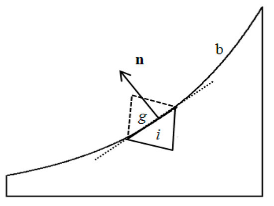 No-slip and adiabatic boundary conditions are applied. To compute the flux through the wall of b, which relates the triangle mesh i, as shown in Figure 3, a ghost triangle mesh g is constructed first. Letting , , and be the average density, pressure, and velocity over mesh i, respectively, the corresponding values in the ghost cell are computed as follows: