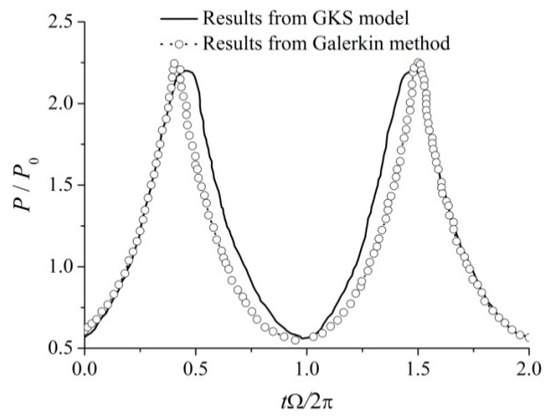 To verify the present GKS model and the relevant code, the numerical results from this work were compared with values predicted by using the Galerkin method. Figure 4 shows the curves of the pressure waves during two acoustic periods, calculated from these two methods. The pressure, P, in Figure 4 is P0 + p, where p is the oscillated pressure. The non-dimensional parameter expresses the acoustic cycle time under steady state, which is the same as that in Figure 2 of Reference [19]. The solid line denotes the results from the GKS model with shape parameter m = 2.0, and the circular symbol represents the results obtained with the Galerkin method, from Reference [19], with flare constant = 4.0. Here, a shape parameter, m = 2.0, is corresponding to a flare constant, = 4.0, and the non-dimensional velocity amplitude of the piston is U* = 5 × 10−4. The physical model and parameters settings are the same as in the literature [19], for convenient comparison. A slight discrepancy can be observed between the two waveforms, but overall, they seem to be in good agreement. The possible cause for the discrepancy may come from the different governing equations. The results from the Galerkin method are based on a one-dimensional wave equation, while the present results from the GKS are two-dimensional.