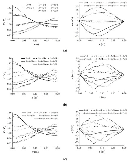 The figures in Figure 8 indicate that the flow fields for Case A at and are more complicated than those at the other two moments in one acoustic cycle; a vortex pair is formed on either side of the tube where it is enlarged and contracted. It appears that the vortices generate and vanish periodically. Vortices are accompanied by a larger temperature gradient and a smaller velocity gradient at and , but a nearly uniform temperature field and greater velocity fluctuation, as well as smoother streamline, can been observed at and . The streaming that was superposed on the main flow developed owing to the generation, evolution, and shedding of vortices, which is referred to as the third type of direct current (DC) flow in Reference [12]. The DC flow is driven by the asymmetry of the fluid flow and temperature and transmitted by the vortices, and it accompanies energy storing and releasing in a cycle.