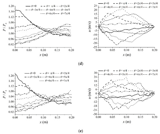 Variation of pressure (left column) and u velocity (right column) along the symmetry axis of the m = 2.2 exponential resonator at eight different instants ( and ) during one acoustic cycle for (a) Case A, (b) Case B, (c) Case C, (d) Case D, and (e) Case E.