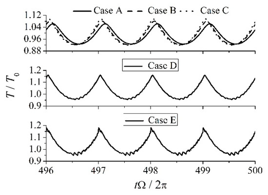 Figure 7 shows the variation of temperature near the position (x = 0, r(x) = 0) over four standing wave cycles from Cases A–E for the m = 2.2 exponential tube. Several changes are shown in Figure 7 for temperature waveform and its amplitude and phase as the driving strength increases. From Cases A–C, little changes in the waveforms and amplitudes are observed, and the phases shift slowly. However, drastic changes in waveforms and amplitudes occur from Cases C and D and, in particular, Case E. Narrower peaks and broader troughs can be seen in Case D and Case E; distortion waves first appear at the troughs in Cases D and E that then affect the peaks in Case E. These phenomena imply a rapid growth of energy dissipation for Cases D and E. However, no “discontinuity wave” or “shock wave” or their analogs can be observed in Figure 7, even at large driving amplitudes.