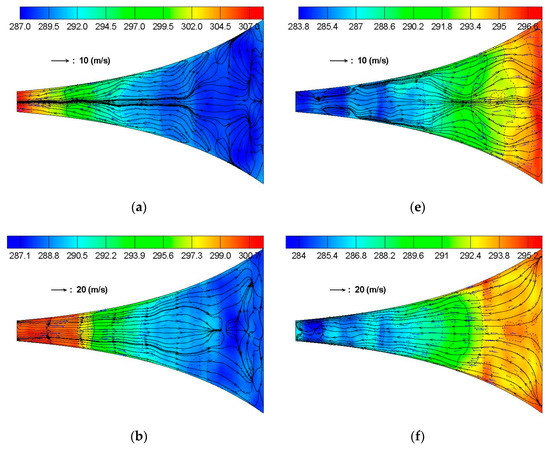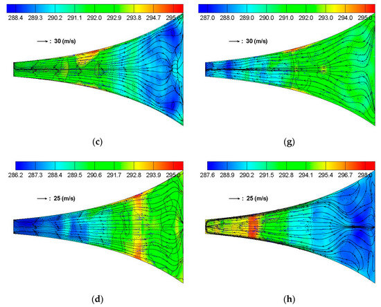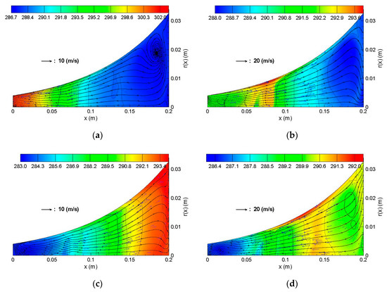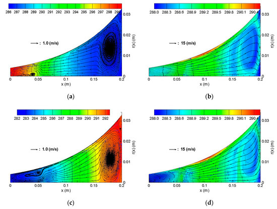 Figure 8 and Figure 9 show the transient flow fields in terms of streamline at typical moments (, and ) during one acoustic cycle in the m = 2.2 exponential tube for Cases A and C, respectively. The color contours indicate the distribution of the temperature (K), and the reference velocity is the u velocity (m/s). Considering the symmetry, only the top half part of the flow fields is depicted here. The evolution processes of the flow and streaming for different driving strengths are very different, which is the most important and interesting point. The flow direction and phase shown in these figures change with increasing driving amplitude, because the fundamental modal frequency of the exponential resonator increases with increasing driving strength [10].