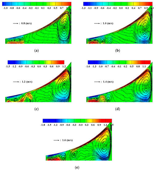 Figure 8 and Figure 9 indicate that the DC flow is very sensitive to the intensity of the flow field because the pressure differential, wave amplitude, and the corresponding vortex propagation speed are different. Here, a detailed analysis is given for Case E, with large driving amplitudes. The instantaneous velocity distributions at eight different instants (, and ) during one cycle, along with the streamlines, are shown in Figure 10; the whole flow fields are depicted in the figure for better flow visualization.