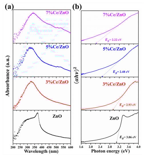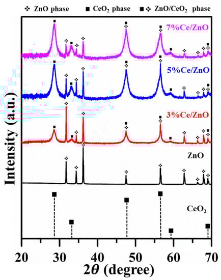 - Khan, M.M.; Khan, W.; Ahamed, M.; Alhazaa, A.N. Microstructural properties and enhanced photocatalytic performance of Zn doped CeO2 nanocrystals. Sci. Rep. 2017, 7, 12560. [Google Scholar] [CrossRef]