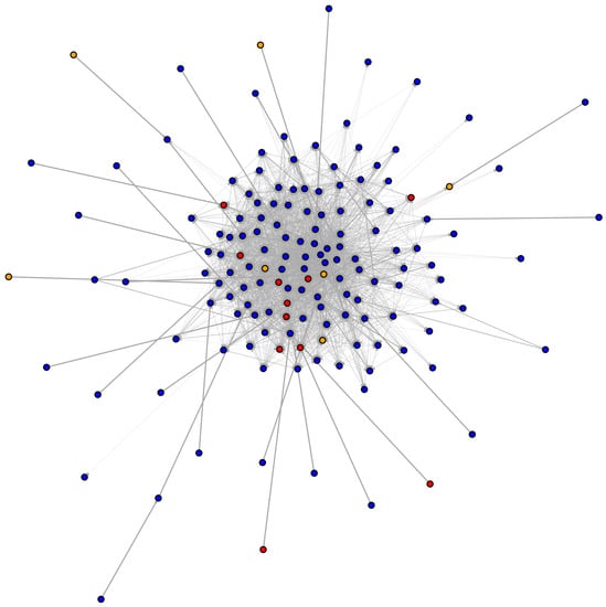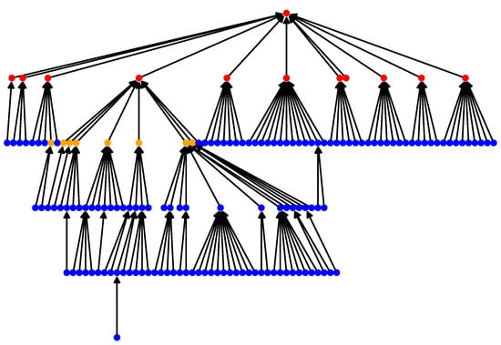 Weighted and directed social network in a manufacturing company built upon e-mail communication. The colouring scheme is the same as for Figure 1: red nodes—first level management, orange nodes—second level management, blue nodes—regular employees. The algorithm used for visualisation is a force-directed large graph layout [] with the root node with the highest betweenness.