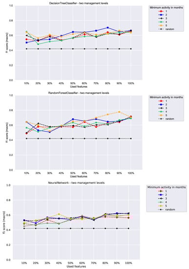 Machine learning can be considered an application of artificial intelligence that provides systems the ability to automatically learn and improve from experience without being explicitly programmed []. The set of tools derived from the field of statistics enables the possibility to perform multiple tasks far exceeding human capabilities or simple algorithms in variety of disciplines, ranging from text analysis, computer vision, medicine and others. In machine learning, classification is a supervised learning approach in which the algorithm learns from the data input given to it and then uses this learning to classify new observation. Here, by supervised we mean providing the algorithm instances of objects that have been categorized as belonging to certain class and requiring it to develop a method to adequately classify other objects without known class. In order to fulfill this goal, numerous algorithms have been developed and tuned over last decades, such as logistic regression [], naive Bayes classifier [], nearest neighbor [], Support Vector Machines [], decision trees [], random forests [] or neural networks []. Each of these methods takes a different perspective to the task. Regarding the methods used in this work, decision trees build a tree consisting of the tests of features: each branch represents the outcome of the test, and each leaf node represents a class label. Random forest extends the concept of decision trees by building a multitude of them and outputs the class that is the mode of the classes of the individual trees. What one can say about these two methods is that the rules of classification are transparent and highly interpretable. Regarding two other methods evaluated in this work, Support Vector Machine constructs a hyperplane or a set of hyperplanes in a high- or infinite-dimensional space, which can be used for classification. Neural networks try to mimic human brain in terms of how information is being passed and analysed. Here, a neural network is based on a collection of connected units or nodes called neurons. Each connection, like the synapses in a biological brain, can transmit a signal to other neurons. An artificial neuron that receives a signal then processes it and can signal neurons connected to it. Neurons are grouped in layers and a signal passing the layers is being converted by neurons into the one that at the final (output layer) will be decided upon the class membership. This creates an architecture of neural network. Contrary to decision trees and random forests, Support Vector Machines and neural networks are not that easily interpretable in terms of the importance of features [].