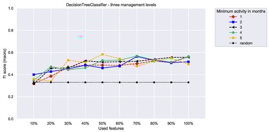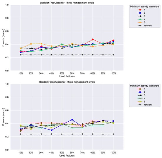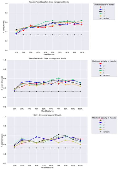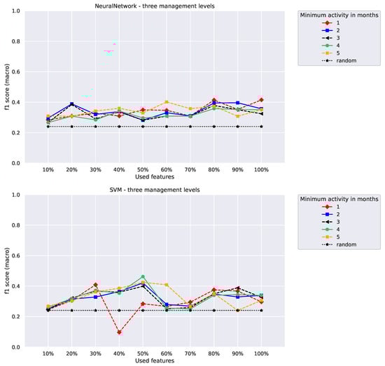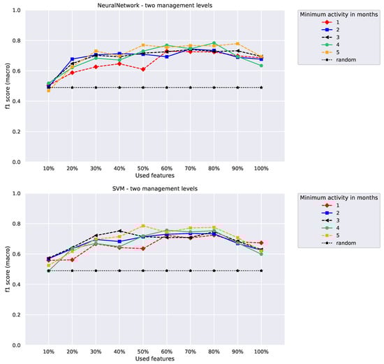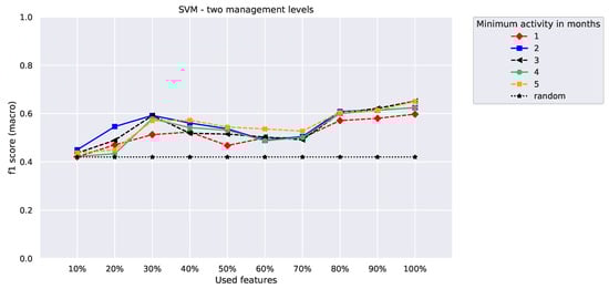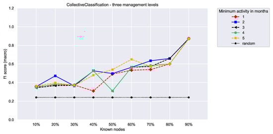 The meaning of the second parameter is checked to see how the activity of a person may have influence on the result of the classification and therefore was examined to see if higher minimum months of employee activity correspond with better results. There is an assumption that some patterns of behavior required more time to be revealed, so the classification was run five times starting with one month minimum activity and ending with 5 months minimum activity. For each value, the network had to be recreated and features calculated again as some nodes were eliminated from the network.