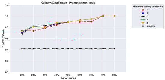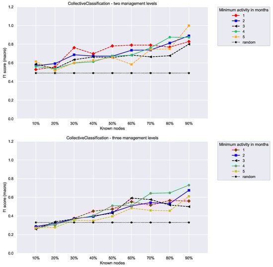 Collective classification is a different way of revealing company hierarchy from a graph perspective. This approach uses the connection between nodes to propagate labels within the whole network. Loopy belief propagation is an example of collective classification described in detail in References [,]. Therefore, in this paper, a simplified version of this algorithm is introduced to compare with standard classification algorithms.