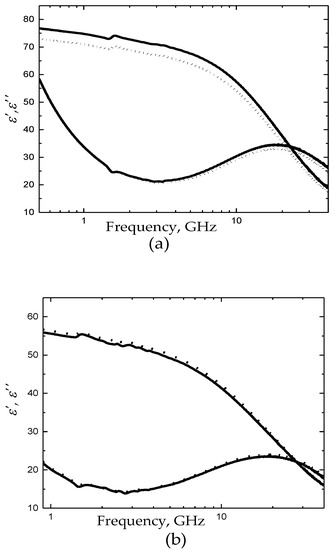 Dielectric measurements were carried out in the frequency range from 500 MHz to 40 GHz using a microwave vector network analyzer N5234B PNA-L (Keysight, Santa Rosa, CA, USA), together with a flexible cable and slim-form probe (Keysight N1501A Dielectric Probe Kit). The calibration of the system was performed with the aid of three references: air, a Keysight standard short circuit, and pure water at 25 °C. Calibration was maintained by Ecal mode. A special stand for the slim-form probe was designed and combined with a sample cell holder for liquids (total volume 7.8 mL). The holder was enveloped by a thermal jacket and attached to a Julabo CF 41 (Julabo, Seelbach, Germany) oil-based heat circulatory system. The cell was held at 25 °C by the circulator-thermostat, with temperature fluctuations less than 0.1 °C. The whole measuring system was placed in an air-conditioned room maintained at 25 ± 1 °C. Each sample was measured at least six times. The real and imaginary parts ε′(ω) and ε″(ω) were evaluated using the Keysight N1500A Materials Measurement Software with an accuracy of Δε′/ε′ = 0.05, Δε″/ε″ = 0.05.