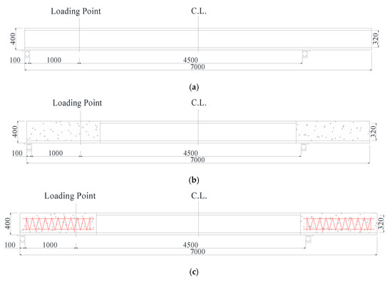 Longitudinal section views of test specimens. (Unit: mm). (a) A-A section of the NR—0/4 specimen. (b) B-B section of NR—2/4 and NR—4/4 specimens. (c) C-C section of LR—2/4 and HR—0/4 specimens.