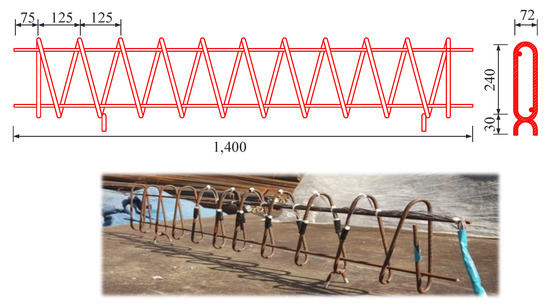 In this study, five PHCS specimens with a thickness of 400 mm were fabricated as shown in Table 2 and Figure 1. The width of the PHCS unit () was 1200 mm, the width of one web () was 55.2 mm, the total width of the web () was 276 mm, and the void ratio was 56%. Eleven prestressing strands with a diameter of 12.7 mm were placed in the lower part of the section, while three 9.5 mm diameter strands were laid in the upper part of the section, to control the tensile stress generated during the introduction of prestress. As shown in Table 2, the first character in the names of the specimen indicates a shear reinforcement ratio (). NR is a specimen without shear reinforcement. LR means a specimen with a relatively low (i.e., ), while HR means a specimen with a relatively high (i.e., ). The number that follows is the ratio of the number of filled cores to the number of entire cores. For example, LR-2/4 represents a specimen in which two of the four voids are filled with normal strength concrete.