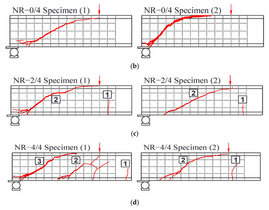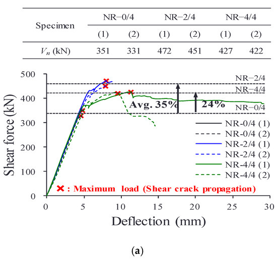 Figure 6a compares the behavior of NR-0/4, NR-2/4, and NR-4/4 specimens to analyze the shear reinforcement effects according to the number of filled cores. Since two tests were performed at both ends for each specimen, the first and second tests were distinguished by adding ‘(1)’ and ‘(2)’ after the specimen name. Figure 6b–d shows crack patterns observed from each specimen, while the numbers shown in Figure 6c,d indicate the order in which the cracks occurred with increasing loads. As shown in Figure 6a, the initial stiffness of the NR-0/4, NR-2/4, and NR-4/4 specimens was almost similar with and without filled cores, and the NR-0/4 (1) and (2) specimens underwent brittle failure simultaneously when web-shear cracking occurred at shear forces of 351.0 and 331.0 kN, respectively (341.0 kN on average). In the case of the NR-2/4 (1) and (2) specimens with two hollow cores strengthened by normal strength concrete, the stiffness started to decrease when flexural cracks occurred prior to the shear cracking; and these specimens showed shear failure as web-shear cracks occurred at the shear forces of 472.0 and 451.2 kN, respectively (461.6 kN on average). The NR-4/4 (1) and (2) specimens in which all the hollow cores of the PHCS unit were strengthened by in-fill concrete showed a sharper decrease in stiffness, as compared to the NR-2/4 specimens, after the flexural cracks were observed, and they underwent web-shear failure at the shear forces of 426.9 and 422.3 kN, respectively (24.6 kN on average).