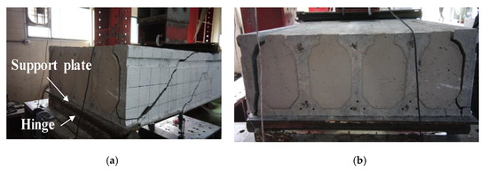 Table 4 compares the shear strengths of the specimens. The shear strengths of the NR-2/4 (1), (2), and NR-4/4 (1), (2) specimens increased by 32%–38% and 24%–25%, respectively, compared to the shear strength of the NR-0/4 specimen. However, in the case of the NR-4/4 specimen, with all four hollow cores strengthened, the shear reinforcement effect was smaller than that of the NR-2/4 specimen. This is because as shown in Figure 7, the web of the PHCS unit at the edge of the NR-4/4 specimen was separated from the filled core before reaching the ultimate load, and failed to resist external shear forces. The crack in the interface between the PHCS unit and the filled core initially occurred near the top flange opened for core-filling, and spread towards the bottom of the section along the interface. Figure 7b shows that at the time of shear failure of the member, the PHCS unit, and filled core were completely separated. Despite this, considering the fact that the PHCS units are continuously placed in an actual construction site, and cast-in-place concrete or non-shrink mortar is poured between the members, the separation of the PHCS unit web from the filled core would be delayed. However, additional experimental research is needed to verify such estimation.