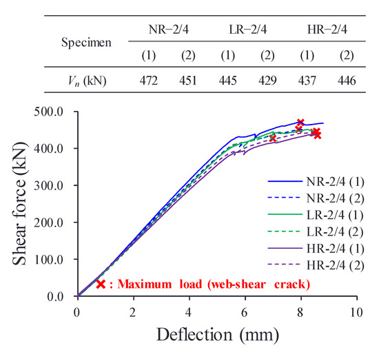 - The shear strengths of the LR-2/4 and HR-2/4 specimens strengthened with helix reinforcing bars were almost similar to the shear strength of the NR-2/4 specimen without shear reinforcement. In other words, the shear reinforcement did not exert a proper shear resistance, which is because the shear crack did not cross the helix reinforcing bars.