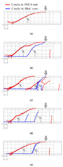 Difference between crack patterns of the PHCS unit and filled core. (a) NR-0/4 specimen. (Inclined crack angle —30°). (b) NR-2/4 specimen. (Inclined crack angle—PHCS unit: 35°, filled core: 53°). (c) NR-4/4 specimen. (Inclined crack angle—PHCS unit: 34°, filled core: 76°) (d) LR-2/4 specimen. (Inclined crack angle—PHCS unit: 33°, filled core: 70°). (e) HR-2/4 specimen. (Inclined crack angle—PHCS unit: 34°, filled core: 65°).