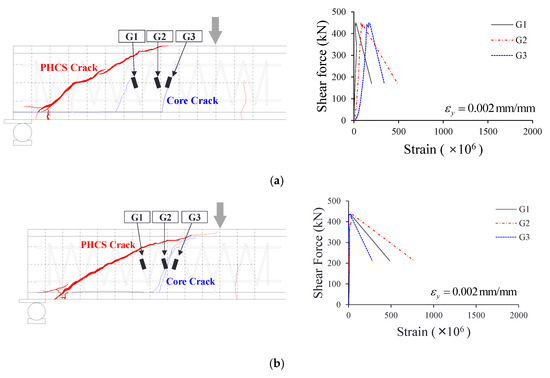 The shear resistance mechanism of the PHCS with filled cores was analyzed based on the test results shown in Figure 6, Figure 7, Figure 8, Figure 9 and Figure 10. It is estimated that when a large shear force is applied to the member, a slip occurs at the interface between the PHCS unit and the filled cores, making them difficult to exhibit full composite behavior. As the slip increases, the shear stress transferred from the PHCS unit to the filled cores decreases, and thus the shear demand of the PHCS unit increases. Therefore, the PHCS unit reaches its potential shear capacity before the filled cores. In other words, it is considered that the filled cores partially contributed to the shear resistance of the member, but failed to reach 100% of its shear capacity, because the shear stress transmitted by the bond stress was insufficient due to the slip between the PHCS unit and filled cores. For this reason, the shear reinforcement also did not contribute to the shear resistance mechanism.