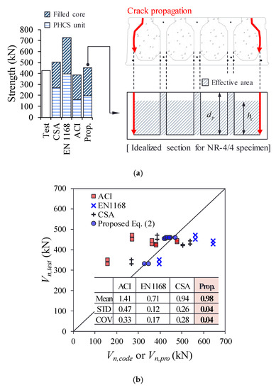 where, is the ratio of the number of filled cores to the number of entire hollow cores (), and are the concrete compressive strength of filled core and the PHCS unit, respectively, is the compressive stress of concrete at the centroid of the section due to effective prestress, and are the width and height of filled cores, respectively, is the web width of the PHCS unit, and is the depth of the prestressing strand. In addition, when is less than 1.0, is taken at 1.0; while if is 1.0, it is calculated at . As shown in Table 6 and Figure 11b, the proposed Equation (2) provided very accurate evaluations on the shear strengths of all the specimens, regardless of the number of filled cores (i.e., the average and the coefficient of variance (COV) of were 0.98 and 0.04, respectively). However, it should again be noted that when the PHCS is utilized in the actual construction field, the members are continuously placed, and cast-in-place concrete or non-shrink mortar is poured between the members, which may delay the separation of the PHCS unit web from the filled cores. In this regard, there is a need to conduct additional experimental research.