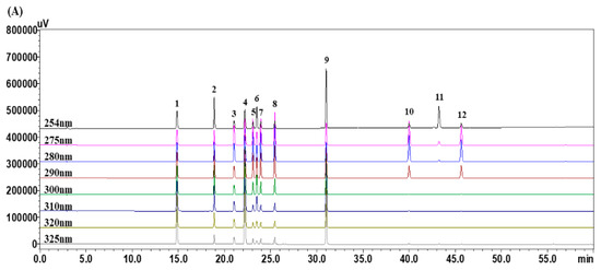 2.5. HPLC Apparatus and Conditions for Simultaneous Analysis of the 12 Marker Components