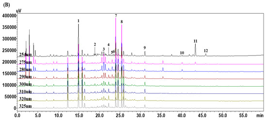 HPLC chromatograms of the standard solutions (A) and YPS sample (B). 3-CQA (1), CFG (2), LIQA (3), FA (4), NAR (5), 5-MVS (6), NAG (7), NHES (8), OPDH (9), ARC (10), GA (11), and 6-GIN (12).