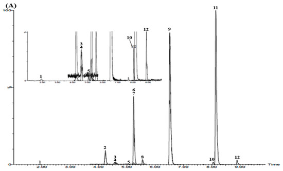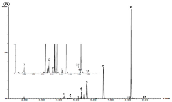 Total ion chromatograms of the reference standard (A) and YPS sample (B) by UPLC–MS/MS MRM mode. 3-CQA (1), CFG (2), FA (3), LIQA (4), NAR (5), 5-MVS (6), NAG (7), NHES (8), OPDH (9), GA (10), ARC (11), and 6-GIN (12).