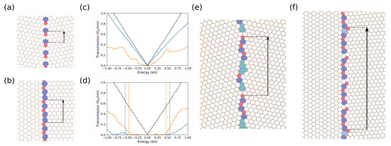 GBs are subsequently classified as either transparent (class-I) or reflective (class-II) to electronic transport. First, a symmetric GB with and Å is investigated as illustrated in Figure 1. The system is transparent, as expected from its symmetry, with a conductance comparable to pristine graphene despite the large concentration of pentagon-heptagon pairs (see Figure 1a,c). In the asymmetric case (see Figure 1b,d), a transport gap of 0.92 eV appears when , and Å, in relative accordance with Equation (4). Outside the transport gap, transmissions are considerably smaller compared to pristine graphene. However, systems considered in Figure 1a,b have short periodicities and are not representative of real GBs which exhibit a more complicated atomic structure. Consequently, more realistic GBs constructed from more complicated arrangements of polygons are studied hereafter. First, an asymmetric class-I GB is examined. This system is defined by , and Å, as illustrated in Figure 1e. The corresponding transmissions are significantly lower than pristine graphene, indicating an increased scattering due to the presence of dangling bonds. An asymmetric class-II GB is then considered, with , and Å (see Figure 1f). The interface was constructed by creating a vacancy after repeating n times an initial pattern (here ), which corresponds to applying a perturbation approach to the periodicity assumption. The related transmissions depicted in Figure 1d show a transport gap of 0.76 eV. However, a logarithmic scale plot analysis reveals non-zero conductance as large as G nm in the transport-forbidden energy range. This implies that the transport gap depends on the smallest perceptible periodicity while perturbations in periodicity induce leakage currents.