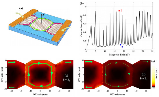 Aharonov–Bohm interferences in polycrystalline graphene in the quantum Hall regime: (a) Schematic of considered systems, (b) computed conductance as a function of the magnetic field, and (c,d) images of the local density of left-injected electronic states at magnetic fields (c) (conductance peak), marked in red in (b,d) (conductance valley) marked in blue in (b). Reprinted and adapted with permission from reference [46].