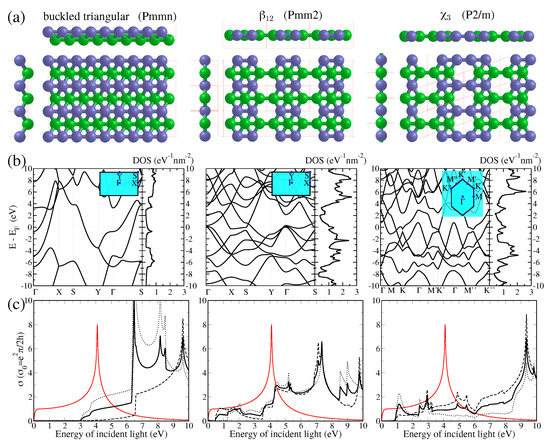 Electronic and optical properties of borophene monolayers: (a) Three 2D crystal polytype structures of borophene with increasing boron vacancies, i.e., buckled triangular, , and , with in (b) the corresponding electronic band structures and in (c) the corresponding longitudinal optical conductivities , , and their averaged in dotted, dashed, and thick black line, respectively. Graphene optical conductivity is also given in red line.