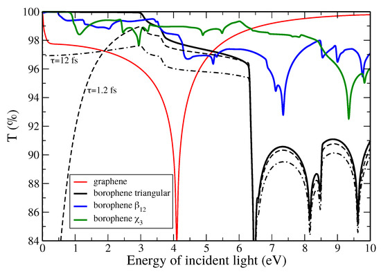 The synthesis of monolayers of boron atoms, so-called borophene, has been reported in 2015–2016 [62,63] showing a rich structural polytype. In particular three important structures have been reported, including a buckled triangular lattice and two flat layers named and (Figure 4a). These three borophene layers are (semi-)metallic as clearly shown by their electronic bandstructure and density of states (Figure 4b). Nevertheless and interestingly, the buckled triangular borophene layer displays a zero optical conductivity up to 3 eV (Figure 4c) and, hence, absorbs light only in the UV range or for higher photon energy (with a strong anisotropic character between and ) [59]. In contrast, and borophene layers absorb light in the visible range starting from ∼0.5 and ∼1.0 eV, respectively, with a value varying between and . For comparison, graphene exhibits a value slowly increasing from up to roughly at the end of the visible range. This value of for graphene corresponds to the well-known absorbance of % of light, which gives, with reflectance being nearly zero (∼0.05%), the high transmittance displayed in Figure 5. Again, buckled triangular borophene is fully transparent in this visible region neglecting the Drude corrections which, depending on the scattering time , can give rise, at most, to a decrease of transmittance down to 96% in the visible range, i.e., comparable to graphene.