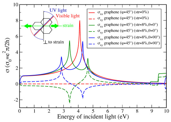 Optical Hall conductivity of unstrained and 8% strained graphene along armchair () and zigzag () direction for incoming light polarized obliquely (). Inset: Sketch illustrating the Faraday rotation mechanism of linearly polarized light (red and blue lines) in uniaxially strained graphene (green line). Visible (UV) light rotates (anti-)clockwise when strain is applied along the armchair direction.
