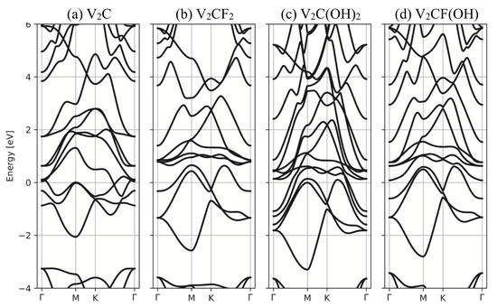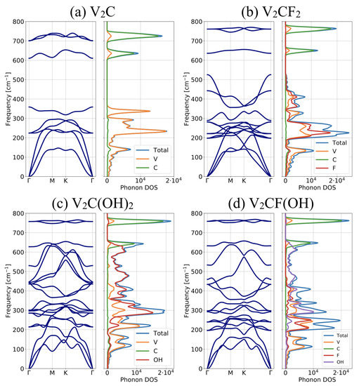 - Champagne, A.; Shi, L.; Ouisse, T.; Hackens, B.; Charlier, J.C. Electronic and vibrational properties of V2C-based MXenes: From experiments to first-principles modeling. Phys. Rev. B 2018, 97, 115439. [Google Scholar] [CrossRef]