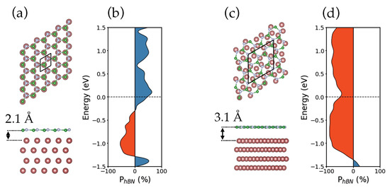 Structural optimization of the aforementioned interfaces indicates a stronger bonding of h-BN with Co in the aligned configuration with respect to the misaligned one. The average distance between h-BN and the FM is of 2.1 Å for the epitaxial structure and of 3.1 Å for the misaligned one. The charge transfer from the ferromagnet to the monolayer and the hybridization of h-BN are consequently affected by the relative crystallographic orientation across the interface. As a result, the computed spin polarization of h-BN (see Figure 10a,c) exhibits opposite sign at the Fermi energy for the two considered geometries. Straight application of the Julliere model, see Equation (10), predicts radically different magnetoresistive behaviour for the aligned and misaligned configurations.