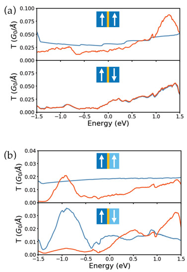 Further calculations of the electronic transmission functions by means of the Green’s function formalism, see Equation (2), confirm the dependence of the spin-polarized tunneling current on the relative crystallographic orientation of the interfaces. The electronic transmission functions computed for a fully epitaxial Co/h-BN/Co junction (i.e., with Co, h-BN, and Co aligned) is reported in Figure 11a for the parallel and anti-parallel magnetizations of the electrodes. In the anti-parallel configuration the transmission functions associated with majority and minority spins are degenerated as expected for a symmetric junction. At equilibrium, the computed TMR is of 36%. The case of an asymmetric junction, where one electrode has been twisted by 21.78°, is considered in Figure 11b. In this configuration, the global amplitude of the transmission is reduced with respect to the epitaxial junction and the spin symmetry of the transmission in the anti-parallel configuration is lifted. The computed TMR at equilibrium is reduced to 15%. This illustrates the strong dependence of the magnetoresistive behaviour of 2D-MTJs on the atomic configuration of interfaces. The calculations were performed within the DFT framework as implemented in the SIESTA electronic structure package [93,94]. Converged k-point grids and a basis set of double- plus polarization quality were used.
